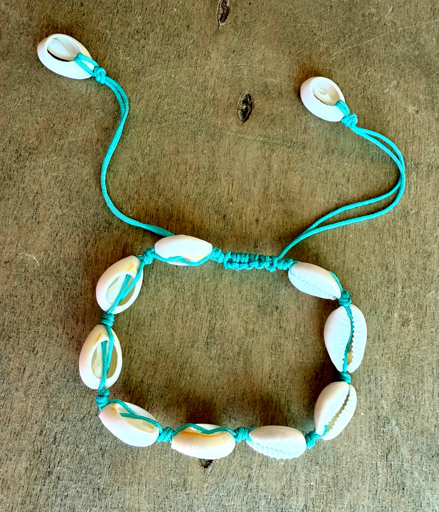 A cute cowrie shell bracelet with each sliced cowrie braided into the bracelet with colorful beads. Perfect for anyone at any age who loves beach themed. Color choice reflects cord color.