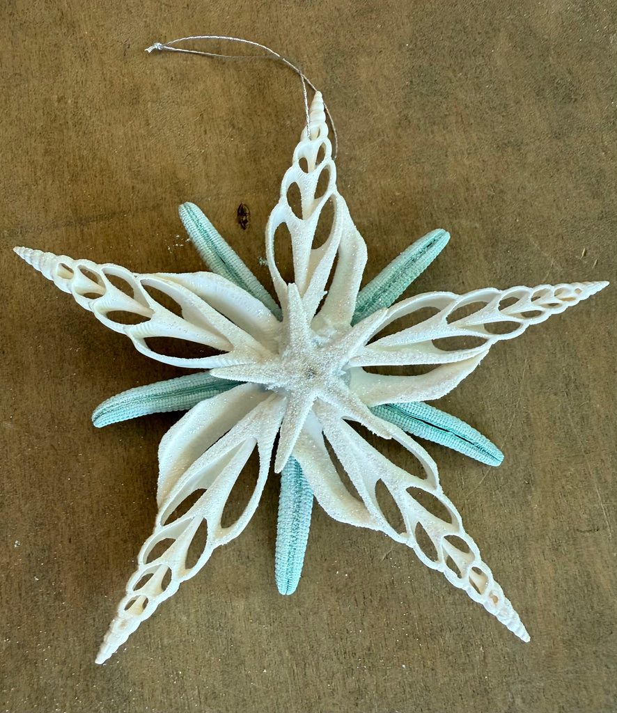 This hand made work of art is made with sliced Rose Bud Shells and real dried Bumpy Seastars that have been dyed blue. This particular ornament is double sided to show off its symmetry and beauty!