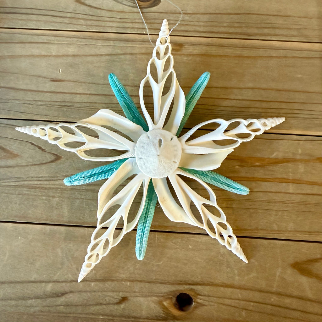 Each Ornament we make will vary due to the natural variations of the seashells and starfish turquoise or blue/green color will vary.