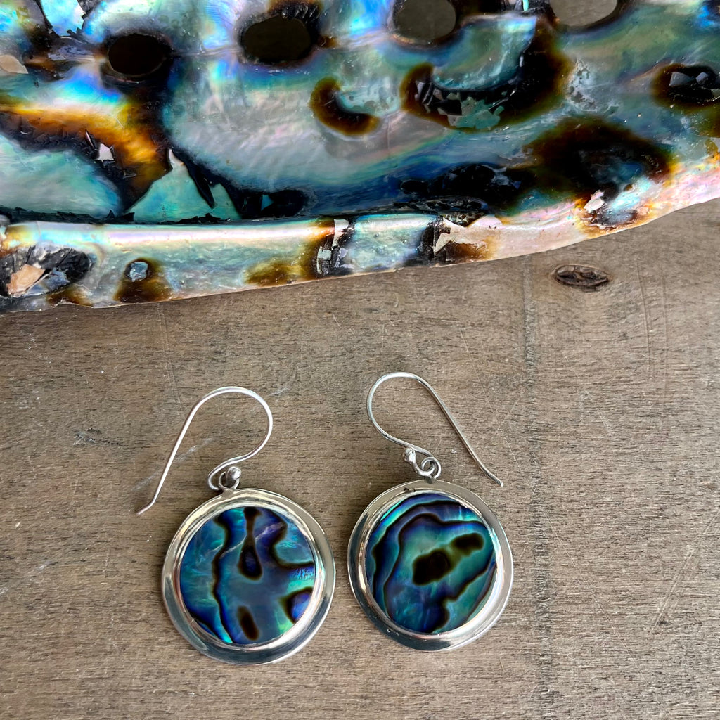 A Gorgeous Blue Abalone color shows beautifully on these Circle Round Earrings
