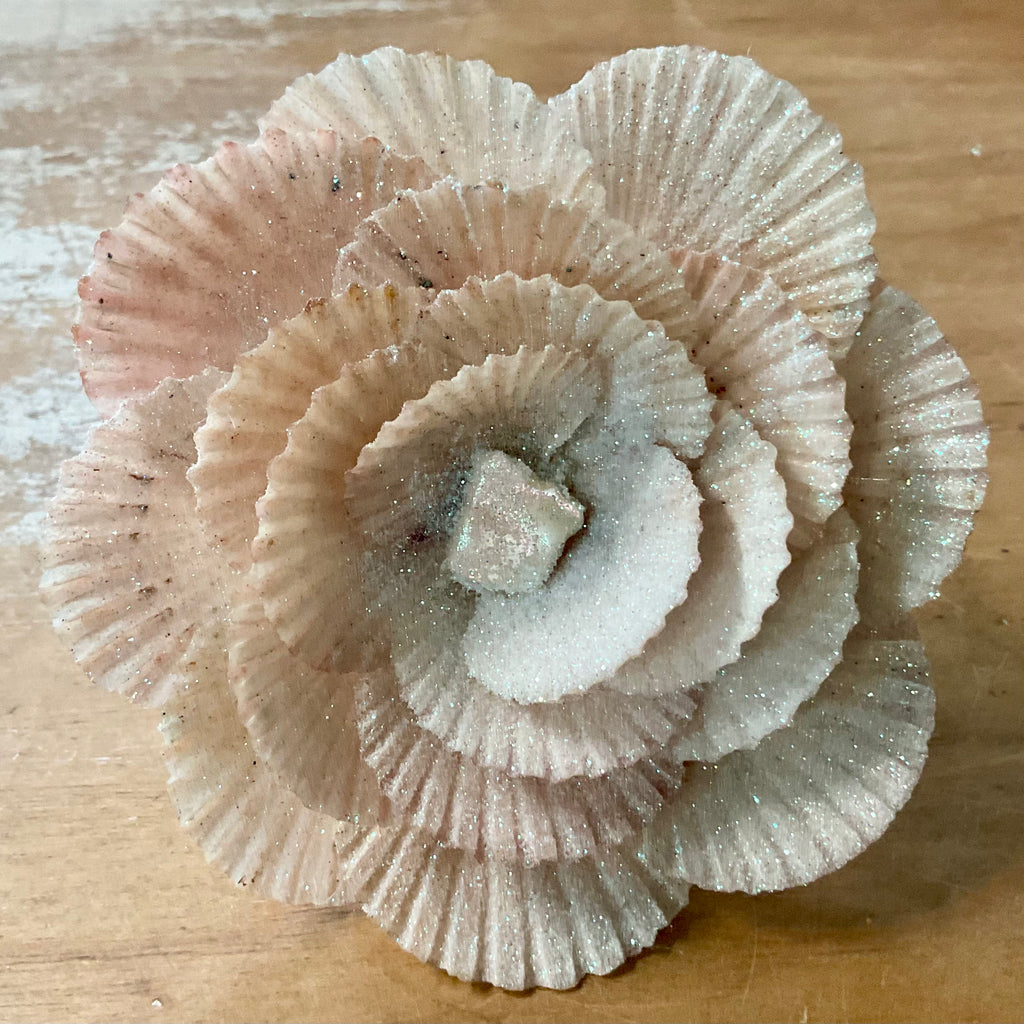 This is a version of our colorful Seashell Flowers where we’ve bent the wire to go on your tree and we’ve added Glitter or some of the large no Glitter have extra shells in center! All will vary.