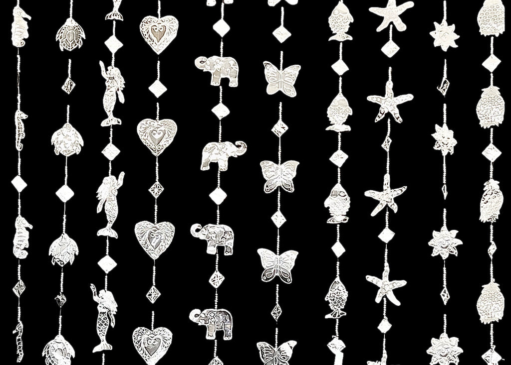 Shimmery stamped tin metal silver beaded garlands come in three styles: Sun, Pineapple, and Starfish.